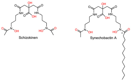 The structures of schizokinen, produced by some Anabaena strains, and synechobactin A produced by Synechococcus sp. PCC 7002. Iron-binding oxygen-atoms are marked in red. The synechobactins are a suite of siderophores with different fatty-acid chain lengths in the (*) marked position.