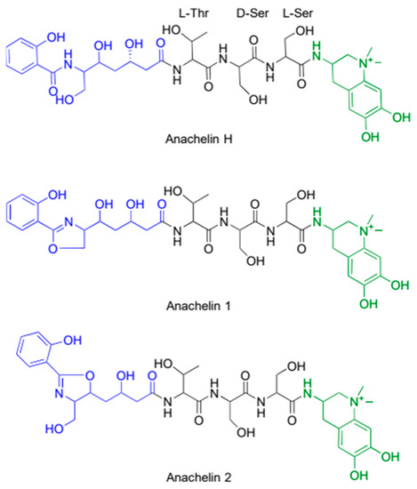 The structures of the catecholate siderophores anachelin, which are produced by Anabaena cylindrica. Anachelins have a tripartite structure, composed of a polyketide (blue), a tripeptide (black) and an alkaloid containing the iron binding catechol moiety (green).