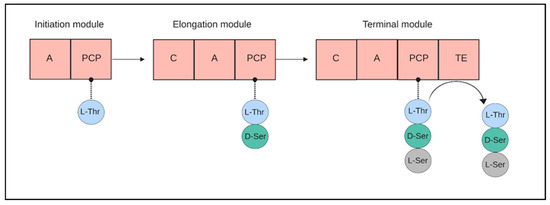 Peptide-based siderophores such as anachelin are often produced by a combination of the systems combining NRPS and polyketide synthases (PKS). NRPS pathways are well studied as they form the biosynthetic basis of a wide variety of peptidic secondary metabolites [71,72,73,74]. The NRPS pathways are typically composed of multi-domain peptide synthases, where a peptide bond formation between the amino acids is catalyzed by consequent modules [75]. Each amino acid bound to the chain requires a separate module, which is composed of three domains: The amino acids are activated by the adenylation domain (A), while monomers are transferred by the peptidyl carrier domain (PCP). A condensation (C) domain then forms the peptide bonds between the amino acids. In the end, the mature oligopeptide is released by a thioesterase (Te) domain (Figure 3). Often, NRPS is coupled with the activity of polyketide synthases (PKS) to create more complex structures [76].