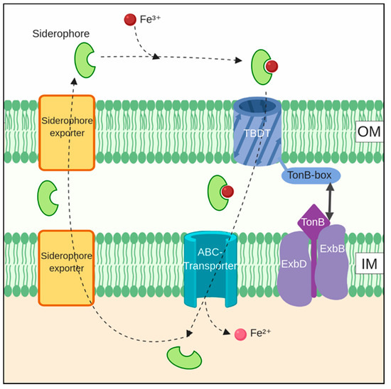 The import of iron-loaded siderophores is broadly similar across many bacteria and is illustrated in Figure 4. The transport of incoming siderophore-iron complexes into the periplasmic space is enabled by receptor proteins, TonB-dependent transporters (TBDT) located in the outer membrane. TBDTs consist of a β-barrel domain and a “plug” domain in the barrel interior that acts in concert with a TonB-box on the periplasmic side. Energy for transport is derived from the proton-motive force and is mediated through the association of TonB with inner membrane proteins ExbB and ExbD, forming a TonB-ExbB-ExbD-complex. Once in the periplasm, Fe3+-loaded siderophores are transported across the inner membrane, often by ABC-transporters [90].