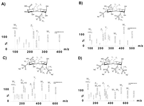 - Saad, O.M.; Leary, J.A. Delineating mechanisms of dissociation for isomeric heparin disaccharides using isotope labeling and ion trap tandem mass spectrometry. J. Am. Soc. Mass Spectrom. 2004, 15, 1274–1286. [Google Scholar] [CrossRef] [PubMed]