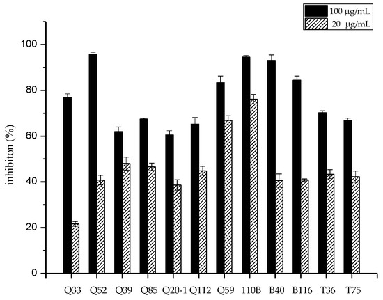 Fifty-one strains belonging to the genus Micromonospora were isolated from mangrove soil samples. The crude extracts of these isolates were examined for their cytotoxic activity. After primary screening, 12 strains showed cytotoxic activity to the human lung tumor cell line A549 (Figure 1). The 16S rRNA genes of the 12 strains were sequenced and the sequences were blasted against GenBank (https://www.ncbi.nlm.nih.gov/genbank/). The results showed that the isolates belonged to seven different species (Figure 2) and that strain 110B was closely related to the type strain Micromonospora aurantiaca ATCC 27029T (CP002162).