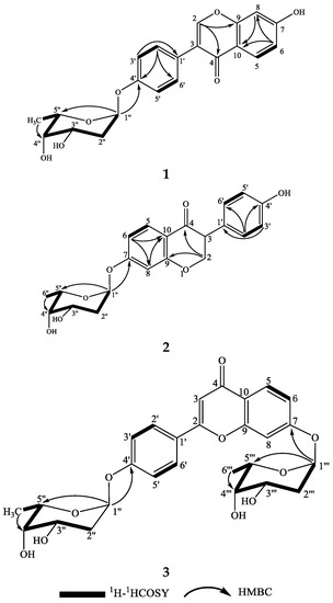 The structures and key 1H–1H COSY and HMBC correlations for compounds 1–3.