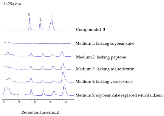 Isoflavonoids have been frequently isolated from bacterial and fungal cultures, but their biosynthetic origin has not been unveiled in all cases. Not all of the isoflavonoids were synthesized ‘de novo’. Ndejouong and Hertweck found that Streptomyces mirabilis could transform isoflavones into hydroxylated and reduced derivatives [25]. In order to clarify whether compounds 1–3 were synthesized ‘de novo’, we carried out a series of experiments. We prepared different media (media 1–4) to explore whether the ingredients in the fermentation medium will affect the production of compounds 1–3, and we mainly focused on the medium that lacked soybean cake or peptone. We found that the three new compounds were only detected in medium containing soybean cake. Then, when daidzein was added to the medium lacking soybean cake (giving medium 5), we could observe formation of these new compounds (Figure 5). These results indicated that M. aurantiaca 110B could transform plant daidzein into fucosylated derivatives.