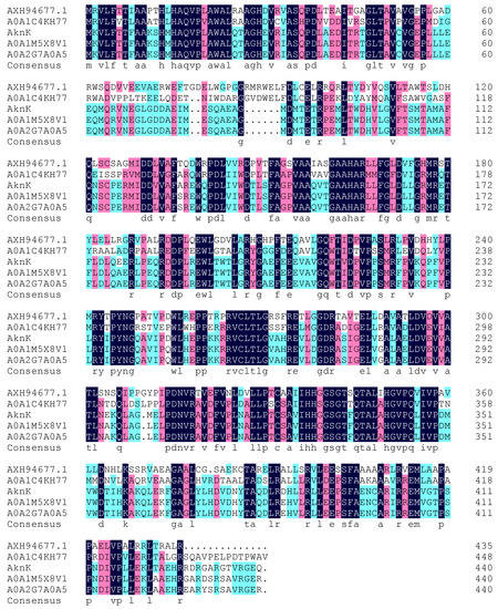 The genome of the strain 110B was sequenced and analyzed. We focused on whether there were any deoxy-sugar-related enzymes in strain M. aurantiaca 110B because the sugar moieties of the three new isoflavonoid glycosides were 2,6-dideoxysugars. Deoxy-sugar glycosyltransferases are interesting enzymes because of their important role in many natural product drugs. Glycosyltransferase-related protein sequences of the M. aurantiaca 110B were aligned with protein sequences of the UniProt database [26,27], and one protein (AXH94677.1) similar to AknK was found (Figure 6). AknK is an l-2-deoxy-l-fucose transferase found in Streptomyces galilaeus, which catalyzes the addition of the second sugar to aclacinomycin A [28]. The genome information of strain 110B also showed that the sugar moieties of the three new isoflavonoid glycosides might be 2-deoxy-fucose. This conclusion was consistent with the results of the structural analysis.