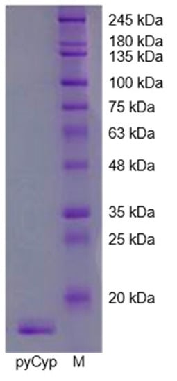Sodium dodecyl sulfate polyacrylamide gel electrophoresis (SDS-PAGE) showed a large amount of polypeptide near 20 kDa after the induction of protein expression with isopropyl-β-d-1-thiogalactopyranoside (IPTG). After Ni–nitrilotriacetic acid (NTA) affinity chromatography, the bands at other molecular weights became faint, and only the band of pyCyp near 20 kDa became thick (Figure 1A). It was highly purified with His-tag attached. Next, His-tagged pyCyp was removed with TEV protease and purified once with HiPrep Sephacryl S-200R HR (Amersham Bioscience, Piscataway, NJ, USA). We confirmed one visible band that has a molecular mass of 18 kDa (Figure 1B).