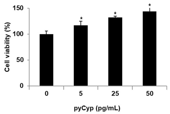 To investigate pyCyp effects in intestinal epithelial cell line (IEC-6), we observed cell viability using MTS assay. After 48 h of pyCyp treatment, cell viability was dose-dependently increased (Figure 2). Especially at 50 pg/mL, viability was increased 40% compared to the control group.
