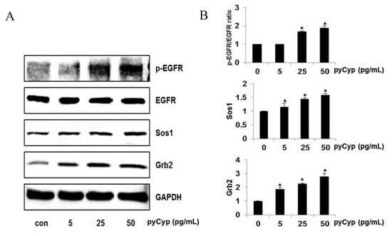 To investigate the mechanism by which pyCyp induces the proliferation of IEC-6 cells, we observed the expression changes of the EGFR-related proteins that are known to be involved in cell proliferation by Western blotting. The targets are phospho-EGFR, Src homology two domain-containingtransforming protein (Shc), growth factor receptor-bound protein-2 (Grb2), and son of sevenless (SOS), which constitute the EGFR in the cell membrane. pyCyp increases the phosphorylation levels of EGFR and the expression of Shc, Grb2, and SOS dose-dependently. These results indicate that pyCyp affects EGFR and induces the expression of related proteins (Figure 3).