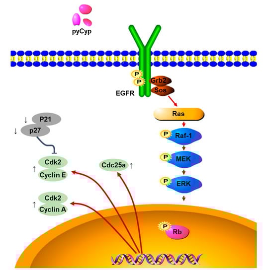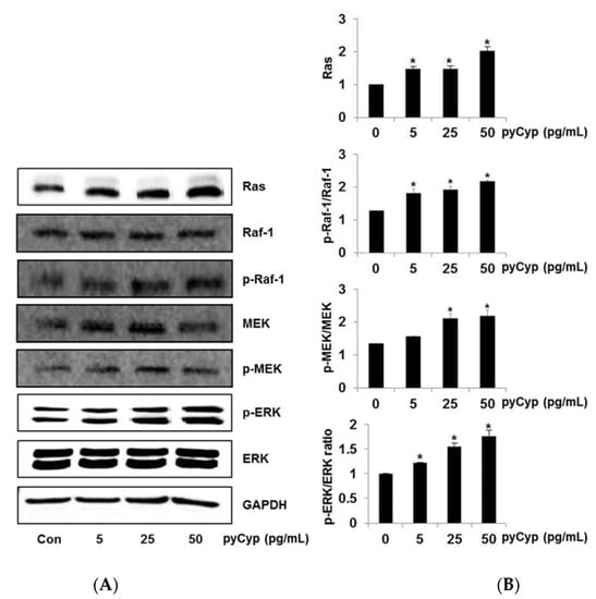 To further investigate the down-signal of EGFR signaling, we examined the Ras–ERK signaling pathway, which is one of the major pathways in EGFR. Its signaling pathway members are renin-angiotensin system (Ras), rapidly accelerated fibrosarcoma-1 (Raf-1), MAPK/ERK kinase (MEK), extracellular signal–regulated kinases (ERK) and so on. The IEC-6 cells were treated with pyCyp for 48 h and analyzed by Western blotting. pyCyp increased the protein expression of Ras, Raf-1, p-Raf-1, MEK, p-MEK, and p-ERK compared with the untreated group. These results mean that pyCyp activates the Ras–ERK signaling pathway following the EGFR signaling pathway (Figure 4).