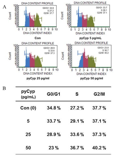 Representative DNA histograms on the cell cycle profile of IEC-6 cells. (A) In the dose-dependence experiments, pyCyp was added at each concentration (0 pg/mL, 5 pg/mL, 25 pg/mL, and 50 pg/mL) for 48 h. Cells were harvested and fixed by 70% ethanol for at least more than 3 h. The cell cycle was analyzed by using flow cytometry (Muse Cell Znalyzer). (B) Change of cell cycle phase ratio by the pyCyp concentration in IEC-6 cells.