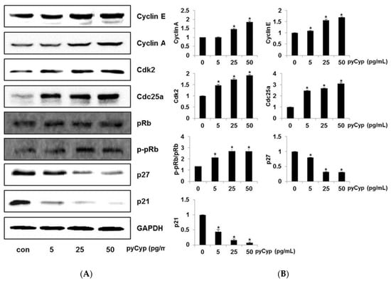 The cell cycle is the entire cycle from one cell to two daughter cells, including DNA synthesis [,,]. In the G1 phase, the cell increases its supply of proteins for DNA synthesis, increases the number of organelles (such as mitochondria, ribosomes), and grows in size. Next, the cell enters the S phase or stops the cell cycle and enters the G0 phase for differentiation. Sometimes, a cell gets arrested in the G1 phase; hence, it may enter the G0 phase or re-enter the cell cycle [,,]. The cell starts DNA synthesis, and the total amount of DNA in the cell is doubled in the S phase [,,]. When it is completed, all of the chromosomes have been replicated. The G2 phase occurs after DNA synthesis, and is a period of protein synthesis and rapid cell growth to prepare the cell for mitosis [,]. In the M phase, the cell separates the chromosomes in its cell nucleus into two identical sets in two nuclei, and finally, the cell is divided into two daughter cells completely [,]. The cell cycle is regulated by several molecules such as cyclin and Cdk. They are involved in each phase of the cell cycle, and their functions are different. While cyclin and Cdk promote cell cycle progression, p27 and p21 inhibit cell cycle progression []. Cyp also is known to regulate the cell cycle []. In this study, we confirmed that the cell cycle was progressed by pyCyp from the G1 phase to the S phase (Figure 5). Cyclin A, cyclin E, Cdk2, and Cdc25a are related in the G1 and the S phases in the cell cycle [,]. In addition, pyCyp increases the protein expression of cyclin A, cyclin E, Cdk2, Cdc25a, and pRb, and decreases p21 and p27 (Figure 6). It indicates that pyCyp promotes cell cycle progression from the G1 phase to the S phase.