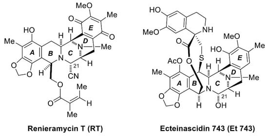 The marine environment represents a countless and diverse resource for many potent bioactive compounds, which have recently been used for new drug developments to treat major diseases such as infection and cancer. Recently, antimicrobial, antitumor, and anti-inflammatory effects have been reported. The number of scientific publications on marine compounds has followed an upward trend in the last twenty years, especially in the field of cancer [24]. From many studies, the marine environment has produced a large number of very potent agents, which are able to inhibit the growth of human cancer cells and exhibit anticancer activities [25]. It has been found that substances from marine organisms have structural and chemical features generally not found in terrestrial natural products; their structures have more complexity and diversity [26,27]. Thus, these marine-derived molecules are capable of interacting with numerous biomolecular targets to either inhibit or promote specific biological functions against various types of cancer cell lines. One of the marine-derived natural products is renieramycins. Renieramycins are alkaloids in the tetrahydroisoquinoline family [28], which is derived from various marine organisms, including sponges in the genera Reniera [29,30], Xestospongia [31,32,33,34,35], Cribrochalina [36,37], and Neopetrosia [38]. However, they are unstable and decomposed after extraction and isolation. Therefore, a very unstable amino alcohol functionality at C-21 in their structure is converted into stable aminonitrile compounds by pretreatment with potassium cyanide [30,39]. In this work, we have focused on renieramycin T (RT), which is the renieramycin-related compound isolated from the Thai blue sponge Xestospongia sp. Normally, the A and E rings in almost all renieramycin structures are in the quinone form, but RT has a substituted aromatic A-ring having a dioxymethylene moiety [39], which is the same as ecteinascidins, another tetrahydroisoquinoline compound isolated from marine tunicates [28,40]. Thus, RT is the renieramycin–ecteinascidin hybrid in the tetrahydroisoquinoline alkaloid family (Figure 1).