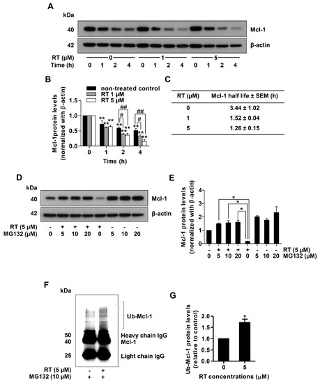 Figure 4A,B shows that in the condition where protein production was blocked, RT decreased the stability of the Mcl-1 protein. The difference was first detected at 4 h after RT treatment (Figure 4A,B). We also determined the Mcl-1 protein half-life and found that the half-life of Mcl-1 protein in the RT-treated groups was about 1.4 h, whereas in the untreated control the value was 3.4 h (Figure 4C). To prove that this decrease in Mcl-1 stability was through proteasomal degradation of the protein, we utilized MG132, a potent selective proteasome inhibitor. Treatment of the lung cancer cells with RT for 4 h dramatically decreased Mcl-1 level, while the addition of MG132 (0–20 µM) could restore the Mcl-1 level (Figure 4D,E). Taken together, it could be concluded that RT induced Mcl-1 proteasomal degradation. Importantly, it was shown that the degradation of Mcl-1 protein required ubiquitination [45]. The tagging of ubiquitin and poly-ubiquitin molecules on the target proteins conferred the recognition of the proteasome providing a specific degradation machinery of certain functional proteins. We also provided the evidence of Mcl-1 ubiquitination using immunoprecipitation and analysis of the Mcl-1-ubiquitin complex (Ub-Mcl-1) in the lung cancer cells treated with RT and non-treated control cells. After treating the cells with 5 µM RT for 4 h, the Mcl-1 protein was selectively isolated from cell lysates by the Mcl-1 antibody. Then, unwanted proteins were washed out and only Mcl-1 complex was analyzed for ubiquitin through Western blot analysis. Figure 4F,G shows that treatment of the cells with RT dramatically enhanced the formation of the Mcl-1-ubiquitin complex compared to the baseline complex in non-treated controls. Taken together, the mechanism of action of RT is through the induction of Mcl-1 degradation via ubiquitin-proteasomal degradation.