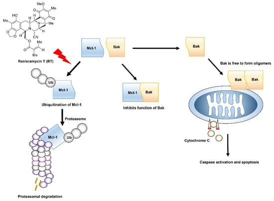 Renieramycin T (RT) enhances apoptosis induction through Mcl-1 proteasomal degradation. Normally, Mcl-1 forms complex with Bak to inhibit its apoptotic function, but when Mcl-1 is degraded through the ubiquitin-mediated proteasomal degradation by treatment of RT, Bak is relieved. Activated Bak forms oligomerization that can permeabilize the outer membrane of mitochondria and release cytochrome c to initiate the apoptosis mechanism.