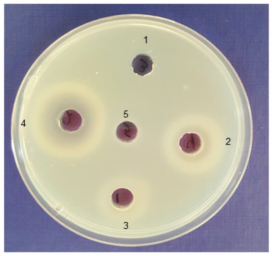 Figure 2. Bifunctional activity of alginate lyase produced by isolated marine bacteria. Enzymes acting against poly-mannuronate (poly-M) show a white halo due to gelation of the degradation products caused by the reaction of lyase with poly-M and enzymes acting against poly-guluronate (poly-G) show a white ring. The lyase activity of the following isolates’ supernatants are shown: 1, Cellulophaga sp. 1423; 2, Pseudoalteromonas sp. 1422; 3, Pseudoalteromonas sp. 1416; 4, Pseudoalteromonas sp. 1400; and 5, well is filled with 1.8% alginate solution in 20 mM Tris-HCl buffer as a blank.