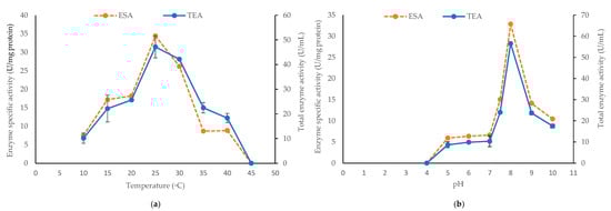 Figure 4. The alginate lyase enzyme specific activity (ESA) and total enzyme activity (TEA) produced by Pseudoalteromonas sp. 1400 after 24 h incubation at 150 rpm with (a) different temperatures and (b) different pH values. One-unit enzyme is defined as the amount of enzyme required to increase the absorbance at 235 nm by 0.01 per minute. The error bars for TEA represented the SD values of three independent experiments as means ± SD (n = 3).