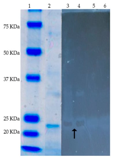 Figure 6. SDS-PAGE (Coomassie blue staining) and zymogram (active staining for alginate lyase) of the purified alginate lyase (AlyP1400) from Pseudoalteromonas sp. 1400. Lanes are as follows, 1, protein markers; 2, 3 and 4 purified alginate lyase (black arrow show the alginate hydrolysis in 3 and 4), 5 and 6 negative control, 0.1% alginate solution in 20 mM Tis-HCl buffer.