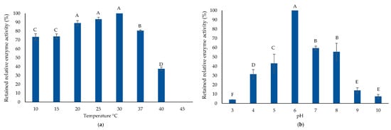 Figure 7. AlyP1400 biochemical characterization. (a) Thermal enzyme stability and (b) the pH stability of the purified AlyP1400 are illustrated. Error bars represent SD of three independent experiments. Different letters indicate statistically significant differences between groups (p < 0.05).