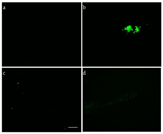 Figure 8. Alginate production by P. aeruginosa PA14 grown under biofilm conditions. Fluorescent microscopic images of bacterial cells incubated with MAb F429 and a secondary antibody conjugated with Alexa Fluor 488 are shown. (a) Non-alginate producer E. coli TOP10, (b) P. aeruginosa PA14, (c) P. aeruginosa PA14 control without the primary MAb F429, (d) PA14 with AlyP1400 enzyme. Scale bar, 10 µm.