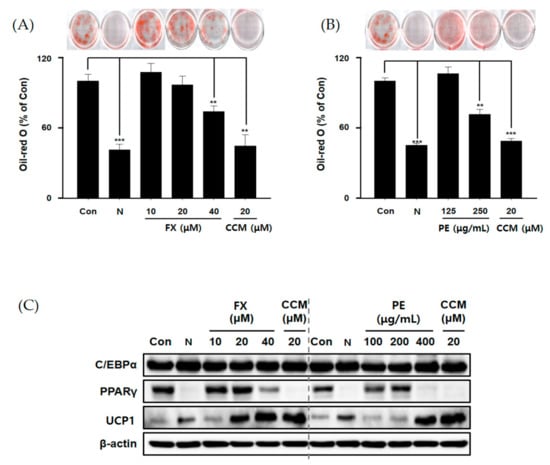 Adipogenic differentiation is related to various adipogenic factors, such as C/EBPα, PPARγ, and UCP1, as mentioned above [12,13,14,15,16]. To determine whether these factors are controlled by FX and PE, we analyzed protein levels in the absence or presence of FX or PE during insulin-induced differentiation. At high levels, FX and PE clearly decreased PPARγ levels and dose-dependently increased the UCP1 level (Figure 1C). However, neither FX nor PE affected the level of C/EBPα. FX was reported to inhibit the intercellular lipid accumulation by reducing the expression of PPARγ and C/EBPα. In the case of C/EBPα, there have been some conflicting results about the effect of FX on the expression of this enzyme during the differentiation period [10,25,26]. In this study, we conclude that FX and PE treatment induced downregulation of PPARγ and upregulation of UCP1 in two key major enzymes (PPARγ and UCP1) in 3T3-L1 cells. We have also shown that FX, a major component of PE, can be one of the main ingredients for the anti-obesity effect of PE. Thus, it was concluded that PE has an anti-obesity effect by controlling lipid metabolism through PPARγ and UCP1.