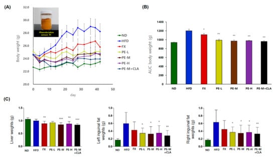 Before treatment, the average initial body weight of the mice was 24.38 g, with no significant differences among the 7 groups. As shown in Figure 2A,B, the high-fat diet (HFD) group showed a large increase in body weight during the experimental period. After 6 weeks, the area under the curve (AUC) of body weights was higher in the HFD group than in the normal diet (ND) group and other groups (p < 0.001). Mice in the HFD plus PE treatment group showed a lower AUC level than the HFD group, while mice in the PE plus conjugated linoleic acid (CLA) group showed the lowest AUC level. For body weight gain, all PE-treated groups showed weight loss in a dose-dependent manner compared to the HFD group, with greater effects than in the positive control (FX). As shown in Figure 2C, we weighed the livers and inguinal adipose tissue. As a result, of liver weight measurement, PE treatment groups (PE-L, PE-M, PE-H) and the PE-M plus CLA group showed significantly lower weight values (1.12%~7.45% at p < 0.001 or p < 0.01) than in the HFD group. Inguinal adipose tissue weight was significantly higher in the HFD group than the ND group on both the right and left. However, the PE-treated groups exhibited lower values than the HFD group in inguinal adipose tissue weight over 40% (p < 0.01 or p < 0.05). Based on this result, we concluded that PE exerts anti-obesity effects in vivo in mice.