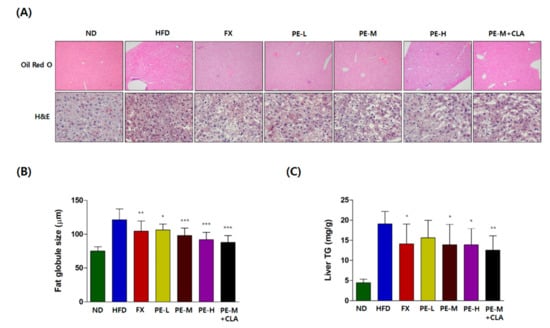 For histological analysis, liver tissues were stained with ORO and hematoxylin and eosin (H&E) to observe the nucleus and cytoplasm of the cell [28]. As shown in Figure 3A, there was no significant difference in the cell staining pattern between the HFD and PE treatment groups in the H&E staining, indicating that the cell states of all groups were normal. However, ORO staining revealed that the livers of the HFD groups contained more lipid droplets than those of the ND group and the FX- and PE-treated groups with the increased fat globule size (Figure 3A). After treatment with FX or PE, the lipid droplet numbers decreased (Figure 3A) and the fat globule sizes reduced strongly to 75.66% of that in the HFD group in a dose-dependent manner (Figure 3B). In addition, the PE-M + CLA group showed the biggest reduction in fat globule size (72.5% of that in the HFD group, p < 0.001) indicating the synergistic effect of CLA on liver fat metabolism. In Figure 3C, the level of liver in TG in the PE-treated group reduced significantly and dose-dependently. These results clearly demonstrated the effect of PE on hepatic steatosis.