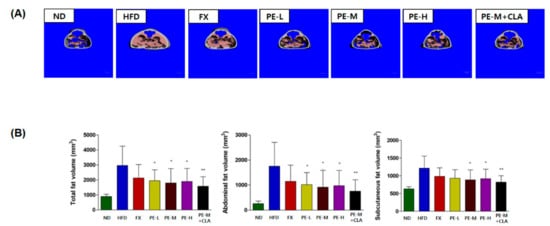 (A) Micro computed tomography (CT) analysis, (B) total, abdominal, and subcutaneous fat volumes. The groups are abbreviated as: Normal diet (ND); high-fat diet (HFD); fucoxanthin (FX), HFD + FX 0.1 mg/kg/day; PE-L, HFD + PE 0.81 mg/kg/day; PE-M, HFD + PE 1.62 mg/kg/day; PE-H, HFD + PE 3.25 mg/kg/day; PE-M + CLA, HFD + PE 1.62 mg/kg/day plus CLA 410 mg/kg/day. ***/**/* indicate significant differences at p < 0.001/p < 0.01/p < 0.05 levels compared to the HFD group. Values are shown as the mean ± SD (n = 10 per group).