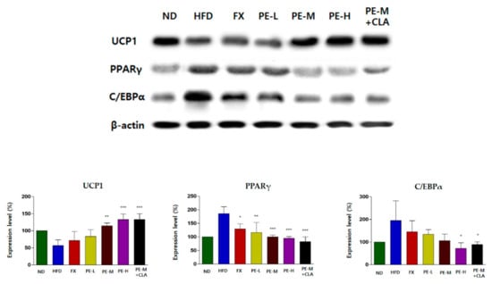 We assessed the expression of UCP1, PPARγ, and C/EBPα, which are related to lipid metabolism in adipose tissue. As shown in Figure 5, UCP1 expression was increased in the PE-treated groups. Particularly, compared to in the HFD group, UCP1 expression levels in the PE-M, PE-H, and PE-M + CLA groups were 2.02-, 2.34-, and 2.35-fold higher, respectively, indicating significant and dose-dependent effects. PPARγ expression levels were significantly lower in the PE-L, PE-M, PE-H, and PE-M + CLA groups than in the HFD group by 0.62-, 0.54-, 0.51-, and 0.45- fold, respectively, with high significance (p < 0.001 or p < 0.01). In addition, C/EBPα expression levels were lower in the PE-treated groups. Significance was low (p < 0.05), which is similar to the in vitro result in Figure 1. Overall, these results suggest that PE can upregulate UCP1, which is related to energy expenditure, and downregulate PPARγ, which is related to adipocyte differentiation.