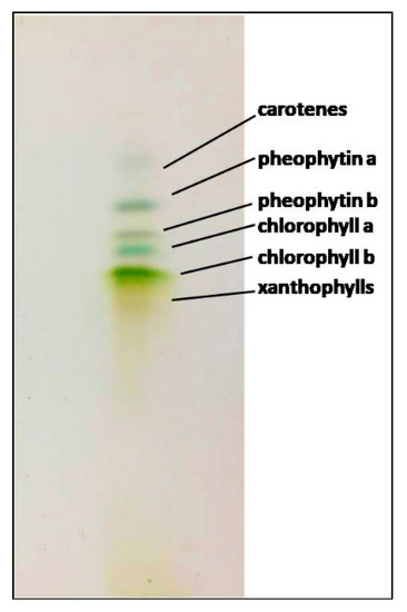 - Pavia, D.L.; Lampman, G.M.; Kriz, G.S.; Engel, R.G. Isolation of chlorophyll and carotenoid pigments from spinach. In Introduction to Organic Laboratory Techniques: A Microscale Approach, 3rd ed.; Saunders College Publishing, Ed.; Brooks Cole: Pacific Grove, CA, USA, 1999; pp. 1–7. [Google Scholar]