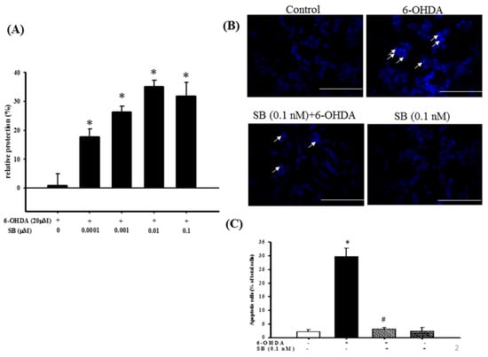 Figure 2. Cytoprotective effect of SB against 6-OHDA damage in SH-SY5Y cells: (A) SH-SY5Y cells were pretreated with 0.1, 1, 10, or 100 nM SB for 1 h and then challenged with 20 μM 6-OHDA for 16 h. Apoptosis in the 6-OHDA-treated group was normalized to 0%. Data are presented as mean ± SEM, and each value represents the mean of three replicates and six samples. * significantly different from the 6-OHDA group; (B) SH-SY5Y cells were pretreated with 0.1 nM SB for 1 h and then challenged with 20 μM 6-OHDA for 8 h. Hoechst 33342 stainings of the control, 6-OHDA, 6-OHDA plus SB, and SB alone groups are shown. The white arrows indicate the locations of chromatin condensation (scale bar = 100 μM); (C) Quantification of cytotoxicity in each group. Data are presented as mean ± SEM, and each value represents the mean of three replicates and three samples. *significantly different from the control group; # significantly different from the 6-OHDA group. p < 0.05.