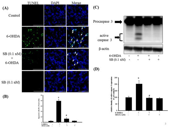 Apoptosis was quantified using TUNEL staining, wherein the enzyme terminal deoxynucleotide transferase attaches deoxynucleotides to the 3′-hydroxyl terminus of DNA breaks that are formed when DNA fragmentation occurs in the last phase of apoptosis. Incubation with 20 μM 6-OHDA for 8 h clearly increased TUNEL staining compared with the control group, and administration of 0.1 nM SB significantly reduced the number of TUNEL-positive cells (p < 0.05). SB alone did not produce a significant change in the number of TUNEL-positive cells (Figure 3A). Quantification showed that 6-OHDA increased apoptotic cell numbers from 2.3% to 40% of the total, whereas pretreatment with 0.1 nM SB significantly attenuated 6-OHDA-induced apoptosis of SH-SY5Y cells (Figure 3B) (p < 0.05). We then examined caspase-3 protein expression by Western blotting to further confirm the relationship between SB and its anti-apoptotic activity. Exposure of 20 μM 6-OHDA for 8 h significantly increased the expression of activated caspase-3, whereas SB significantly blocked its activation (Figure 3C,D) (p < 0.05). Uncropped Western blots of caspase-3 and β-actin were shown in supplemental files (Figure S1).