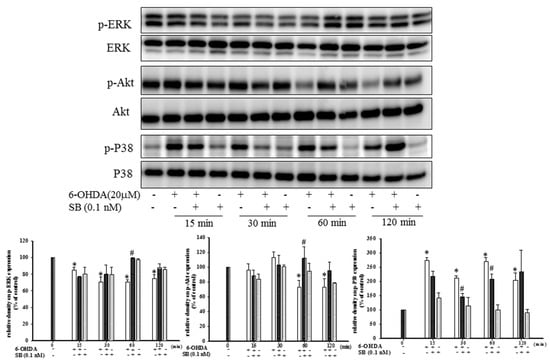 The levels of phospho-ERK, phospho-Akt, and phospho-P38 proteins, which play an important role in neuronal cell survival, were analyzed by Western blotting. Treatment of SH-SY5Y cells with 6-OHDA led to a notable downregulation of phospho-ERK between 15 and 120 min, but this was significantly reversed by pretreatment with 0.1 nM SB for 60 min (p < 0.05); however, incubation with SB alone did not affect phospho-ERK levels (Figure 4). Uncropped Western blots of p-ERK and ERK were shown in supplemental files (Figure S2). Similarly, treatment with 6-OHDA downregulated phospho-Akt between 60 and 120 min, which was significantly reversed by pretreatment with 0.1 nM SB (p < 0.05). As well, treatment with 0.1 nM SB alone did not affect phospho-Akt levels. Uncropped Western blots of p-Akt and Akt were shown in supplemental files (Figure S3).
