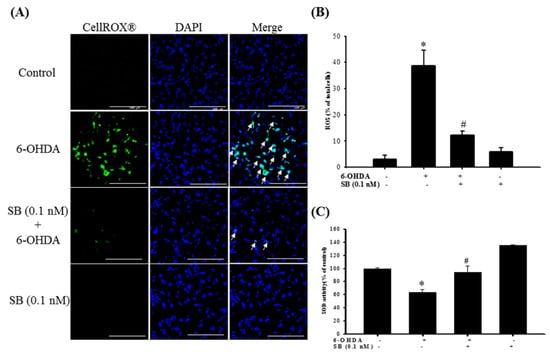 Figure 5. Effect of SB on 6-OHDA-induced upregulation of intracellular reactive oxygen species (ROS) and downregulation of superoxide dismutase (SOD) activity. SH-SY5Y cells were pretreated with 0.1 nM SB for 1 h and then challenged with 20 μM 6-OHDA for 2 h. (A) CellROX® of the control, 6-OHDA, 6-OHDA plus SB, and SB treatment groups. White arrows indicate the location of ROS-positive cells (scale bar = 100 μM). (B) Quantification of the frequency of ROS-positive cells in each group. (C) SOD levels of the control, 6-OHDA, 6-OHDA plus SB, and SB alone treatment groups. Data are presented as mean ± SEM, and each value represents the mean of three replicates and three samples. *significant compared with the control group; # significant compared with the 6-OHDA group.