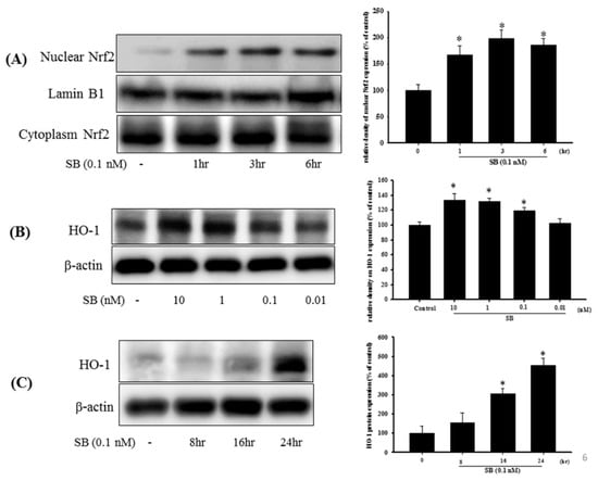 Figure 6. Effect of SB on nuclear factor erythroid-2-related factor (Nrf2) and heme-oxygenase 1 (HO-1) expression in SH-SY5Y cells. (A) SH-SY5Y cells were treated with 0.1 nM SB for 1, 3, or 6 h, and nuclear proteins were isolated using a Nuclear Extraction Kit followed by Western blotting for the Nrf2 protein using lamin B1 as an internal control; (B) Western blotting for HO-1 protein after treatment with SB at 0.01, 0.1, 1, or 10 nM for 16 h using β-actin as an internal control; (C) SH-SY5Y cells were treated with 0.1 nM SB for 8, 16, or 24 h followed by Western blotting for HO-1 protein using β-actin as an internal control. Quantification of blots is shown in the graphs at the right, and data are presented as mean ± SEM with each value representing the mean of three replicates and three samples. * Significant compared with the control group.