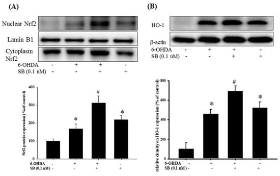 We then tested the effects of SB on the Nrf2–ARE pathway upon 6-OHDA-treatment. After a 3 h exposure to 6-OHDA, expression of Nrf2 increased significantly (p < 0.05). Pretreatment with 0.1 nM SB for 1 h further significantly increased Nrf2 expression (Figure 7A) (p < 0.05). Uncropped Western blots of Nuclear-Nrf2, Cytoplasm-Nrf2 and Lamin b1 were shown in supplemental files (Figures S8 and S9). Treatment with 0.1 nM SB alone also significantly increased Nrf2 expression (p < 0.05). Similarly, pretreatment with 0.1 nM SB for 1 h also enhanced 6-OHDA-induced upregulation of HO-1 expression after exposure to 6-OHDA for 24 h. Finally, 0.1 nM SB treatment alone also significantly upregulated HO-1 expression (Figure 7B) (p < 0.05). Uncropped Western blots of HO-1 and β-actin were shown in supplemental files (Figure S10).