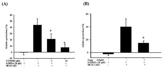Figure 8. Effect of LY294002 and zinc protoporphyrin (ZnPP) on the neuroprotective effect of SB in 6-OHDA-treated SH-SY5Y cells. (A) SH-SY5Y cells were pretreated with 1 or 10 μM LY294002 for 1 h, then with 0.1 nM SB for another 1 h, followed by 20 µM 6-OHDA for 18 h. Relative protection in the 6-OHDA, 6-OHDA plus SB, 6-OHDA plus SB plus 1 μM LY294002, and 6-OHDA plus SB plus 10 μM LY294002 groups is shown; (B) SH-SY5Y cells were pretreated with 10 μM ZnPP for 1 h, then with 0.1 nM SB for another 1 h, followed by 20 µM 6-OHDA for 18 h. Relative protection in 6-OHDA, 6-OHDA plus SB, and 6-OHDA plus SB plus 10 μM ZnPP groups is shown. Data are presented as mean ± SEM, and each value represents the mean of three replicates and three samples. * Significant compared with the 6-OHDA group.