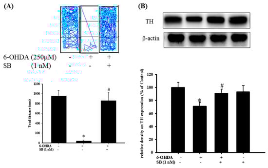 Figure 9. Effect of SB on 6-OHDA-induced locomotor deficiency and tyrosine hydroxylase (TH) expression in zebrafish. (A) Zebrafish larvae were pretreated with 1 nM SB from 9 h post-fertilization (hpf) to 5 days post-fertilization (dpf) and then challenged with 250 µM 6-OHDA from 2 to 5 dpf. The upper panel shows representative data from one experiment, whereas the lower panel shows average results. Data are presented as mean ± SEM, and each value represents the mean 16 samples. * Significant compared with the control group; #compared with the 6-OHDA group; (B) Zebrafish larvae were pretreated with 1 nM SB from 9 hpf to 4 dpf and then challenged with 250 µM 6-OHDA from 2 to 4 dpf; Western blotting for TH of the control, 6-OHDA, 6-OHDA plus SB, and SB alone in 4 dpf treatment groups is shown using β-actin as an internal control. Data are presented as mean ± SEM, and each value represents the mean of three replicates and three samples. Each band contained pooled material from 20 fish. * Significant compared with the control group; # significant compared with the 6-OHDA group.