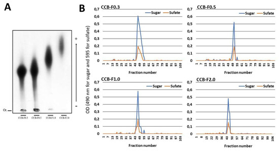 In a previous study [23,24], our group extracted four populations of sulfated polysaccharides from the C. cupressoides seaweed. These populations were named as CCB-F0.3, CCB-F0.5, CCB-F1.0, and CCB-F2.0. In this work, using the same previously described methodology, we also obtained four polysaccharide populations from C. cupressoides. These samples were subjected to agarose gel electrophoresis in PDA buffer. Figure 2A shows an electrophoresis slide stained with toluidine blue. We can see the four populations stained with toluidine blue, indicating that they are constituted of SPs. Different electrophoretic mobility can also be verified: CCB-F0.3 and CCB-F0.5 are polysaccharides of low mobility in comparison with the others, CCB-F1.0 has intermediate mobility, and CCB-F2.0 is the population with higher mobility. By comparing our data with the electrophoresis slide presented by Costa and colleague [24], we can confirm the identity of the polysaccharides obtained.