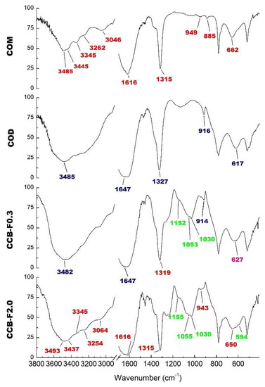 Infrared spectrum of COM crystals, COD crystals and CaOx crystals formed after incubation with Caulerpa SPs (CCB-F0.3 and CCB-F2.0). The values in red indicate the bands that are characteristic of the COM crystals; those in blue are characteristic of COD crystals; in green are the values that indicate the presence of sulfate; and in pink is the band found in the spectra of both crystals (COM and COD).