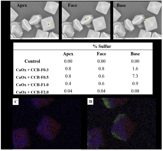 The results from this analysis are summarized in the table of Figure 6B. We observed that three situations occurred in the sulfur distribution: the first occurred in the crystals formed with CCB-F0.3 and CCB-F2.0, where there was twice the amount of sulfur in the region of the base than in the other portions; the second occurred with the crystals formed with CCB-F0.5, where there was almost ten times more sulfur at the base of these crystals than at the apex or face; and the last situation was when there was a different distribution at the base, face and apex, with the amount of sulfur at the base being twice as large as the apex, as was the case with CCB-F1.0.