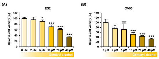 2.1. Gentisyl Alcohol Inhibits Proliferation of Ovarian Cancer ES2 and OV90 Cells