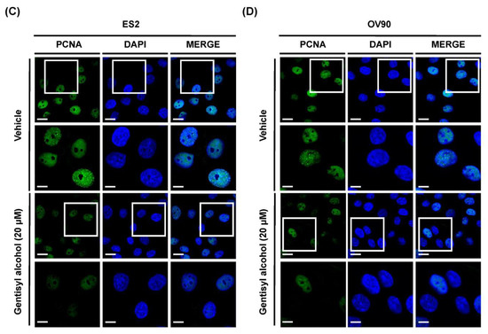 To measure the effects of gentisyl alcohol on suppressing proliferation of human ovarian cancer cells, we performed proliferation assays on ES2 and OV90 cells treated with gentisyl alcohol (0 μM, 2 μM, 5 μM, 10 μM, 20 μM, and 40 μM) in a dose-dependent manner. Our results revealed that gentisyl alcohol suppressed the proliferative activities of ES2 by up to 39% and OV90 by up to 57% at the concentration of 20 μM, as compared to vehicle-treated cells (100%) (Figure 1A,B). In addition, we also detected expression of proliferating cell nuclear antigens (PCNA), which is commonly used as a proliferation marker and emits green fluorescence in immunostained ES2 and OV90 cells (Figure 1C,D). After treatment with gentisyl alcohol, the intensity of green fluorescence was reduced in both the ES2 and OV90 cells. Based on these results, we confirmed that gentisyl alcohol suppresses the proliferation of human epithelial ovarian cancer cells.