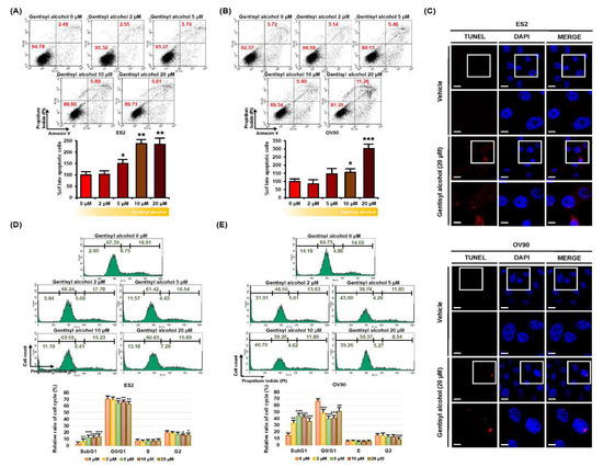 Next, we investigated whether gentisyl alcohol triggers cell death in ovarian cancer cells using annexin V and propidium iodide (PI) staining. As illustrated in Figure 2A,B, the population of ES2 and OV90 cells in the upper right quadrant (indicating late apoptosis) increased by 234% and 303%, respectively, in response to gentisyl alcohol (20 μM) compared to vehicle-treated cells. We also performed the terminal deoxynucleotidyl transferase dUTP nick end labeling (TUNEL) assay (one of the hallmarks of apoptosis) to detect DNA fragmentation on gentisyl alcohol (20 μM)-treated ES2 and OV90 cells using the terminal deoxynucleotidyl transferase (TdT) enzyme reaction (Figure 2C). A higher intensity of red fluorescence was detected in the nuclei of gentisyl alcohol-treated ES2 and OV90 cells than in vehicle-treated cells. Also, gentisyl alcohol induced an accumulation of sub-G1 cells in ES2 and OV90 cells, whereas the populations of G0/G1 and G2 phase cells decreased (Figure 2D,E). These results revealed that gentisyl alcohol induced apoptosis and showed an increase in cell population at the sub-G1 in human epithelial ovarian cancer ES2 and OV90 cells.