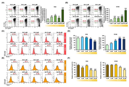 To confirm the functional effects of gentisyl alcohol on ovarian cancer cells, we measured the mitochondrial membrane potential (MMP, ΔΨ) using JC-1 dye, which is converted from a green monomer to a red aggregate in line with the MMP function. Our results indicated that the JC-1 monomer in gentisyl alcohol-treated ES2 and OV90 cells was increased by approximately 428.0% and 620.6%, respectively, at 20 μM of gentisyl alcohol (Figure 3A,B). Moreover, when we measured the relative mitochondrial matrix calcium ion concentration ([Ca2+]m) using Rhod2, which is selectively accumulated in mitochondria, it gradually decreased in response to gentisyl alcohol in ES2 cells but increased in OV90 cells (Figure 3C,D). In contrast, the relative cytosolic calcium concentration ([Ca2+]i), detected by Fluo4, was diminished by gentisyl alcohol in both the ES2 as well as OV90 cells (Figure 3E,F). Therefore, these data suggested that gentisyl alcohol perturbed the mitochondrial function of human ovarian cancer cells, leading to disruption of MMP and calcium homeostasis.