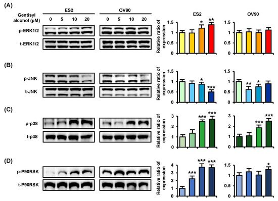 Phosphorylation changes of the MAPK pathway induced by gentisyl alcohol in dose-dependent manners on human ovarian cancer cells. Phosphorylation of (A) ERK1/2, (B) JNK, (C) P38, and (D) P90RSK in gentisyl-treated ES2 and OV 90 cells was analyzed by Western blotting. Each immunoblot was analyzed relative to the total proteins for normalization of values. Asterisks indicate significant effects on treated cells compared to naïve cells (* p < 0.05, ** p < 0.01, and *** p < 0.001).