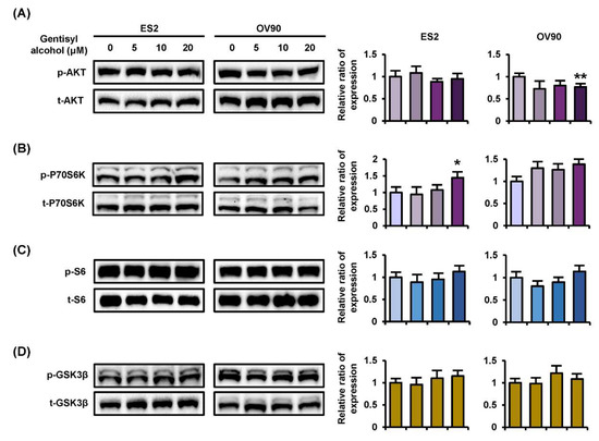 Phosphorylation changes of the PI3K pathway induced by gentisyl alcohol in dose-dependent manners on human ovarian cancer cells. Phosphorylation of (A) AKT, (B) P70S6K, (C) S6, and (D) GSK3β in gentisyl-treated ES2 and OV 90 cells was analyzed by Western blotting. Each immunoblot was analyzed relative to the total proteins for normalization of values. Asterisks indicate significant effects on treated cells compared to naïve cells (* p < 0.05 and ** p < 0.01).