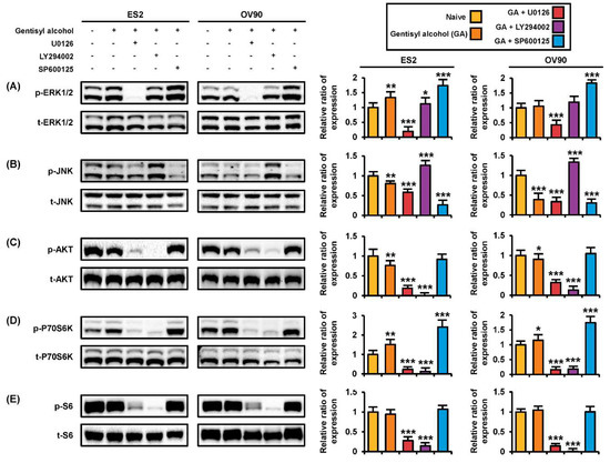 Changes in protein kinase activities on human ovarian cancer cells by co-treatment of gentisyl alcohol and pharmacological inhibitors. (A–E) ES2 and OV90 cells were pre-treated with U0126 (20 μM), LY294002 (20 μM), and SP600125 (20 μM) for 2 h prior to 20 μM of gentisyl alcohol treatment. Immunoblots were analyzed relative to the total proteins for normalization of values. Asterisks indicate significant effects on treated cells compared to naïve cells (* p < 0.05, ** p < 0.01, and *** p < 0.001).