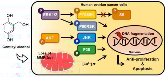 In the present study, we confirmed the effects of gentisyl alcohol on ovarian cancer cells (ES2 and OV90 cells) due to its anti-proliferative and apoptotic activities, which perturbed mitochondrial function and calcium homeostasis by changing MAPK and PI3K/AKT signaling, as illustrated in Figure 7. Based on our results, we suggest that gentisyl alcohol may be a novel anti-cancer supplement or agent for treating ovarian cancers.