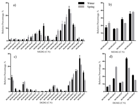 Relative abundance (RA) of molecular species of glycolipids identified in Fucus vesiculosus collected in winter (February) and spring (May), determined by HILIC LC–MS: (a) MGDG, (b) MGMG plus (c) DGMG, and (d) DGDG molecular species. Numbers in parentheses (C:N) indicates the number of carbon atoms (C) and double bonds (N) in the fatty acid side chains. Species with higher RA were highly unsaturated species: MGDG (38:6) to (38:9) (a), and DGDG (38:6) to (38:9) (c). The lyso-galactolipids species with higher relative abundance (RA) were MGMG (18:4) (b) and DGMG (18:1) and (18:3) (d).