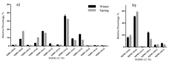 Relative abundance (RA) of molecular species of sulfolipids identified in F. vesiculosus collected in winter (February) and spring (May), determined by HILIC LC-MS: (a) SQDG; (b) SQMG). Numbers in parentheses (C:N) indicates the number of carbon atoms (C) and double bonds (N) in the fatty acid side chains. The species with higher relative abundance were SQDG (34:1) (a) and SQMG (16:0) (b).